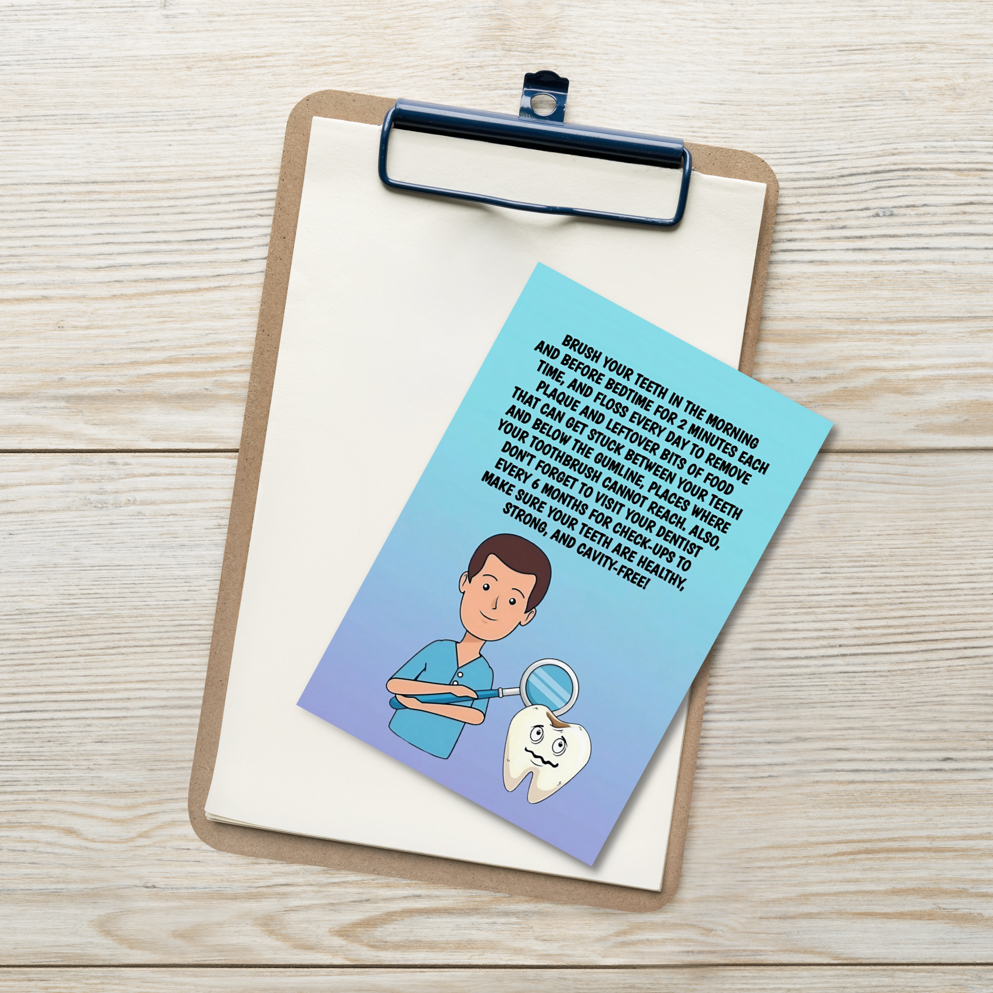 These cards are valuable tools that can be distributed to patients during dental appointments, serving as a prompt for discussing the significance of maintaining proper oral hygiene habits. Dental professionals can easily distribute these cards to reinforce the importance of oral health education with their patients.