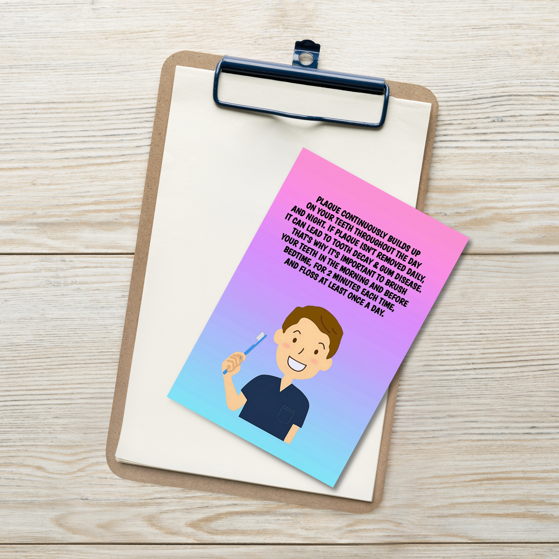 These cards are valuable tools that can be distributed to patients during dental appointments, serving as a prompt for discussing the significance of maintaining proper oral hygiene habits. Dental professionals can easily distribute these cards to reinforce the importance of oral health education with their patients.