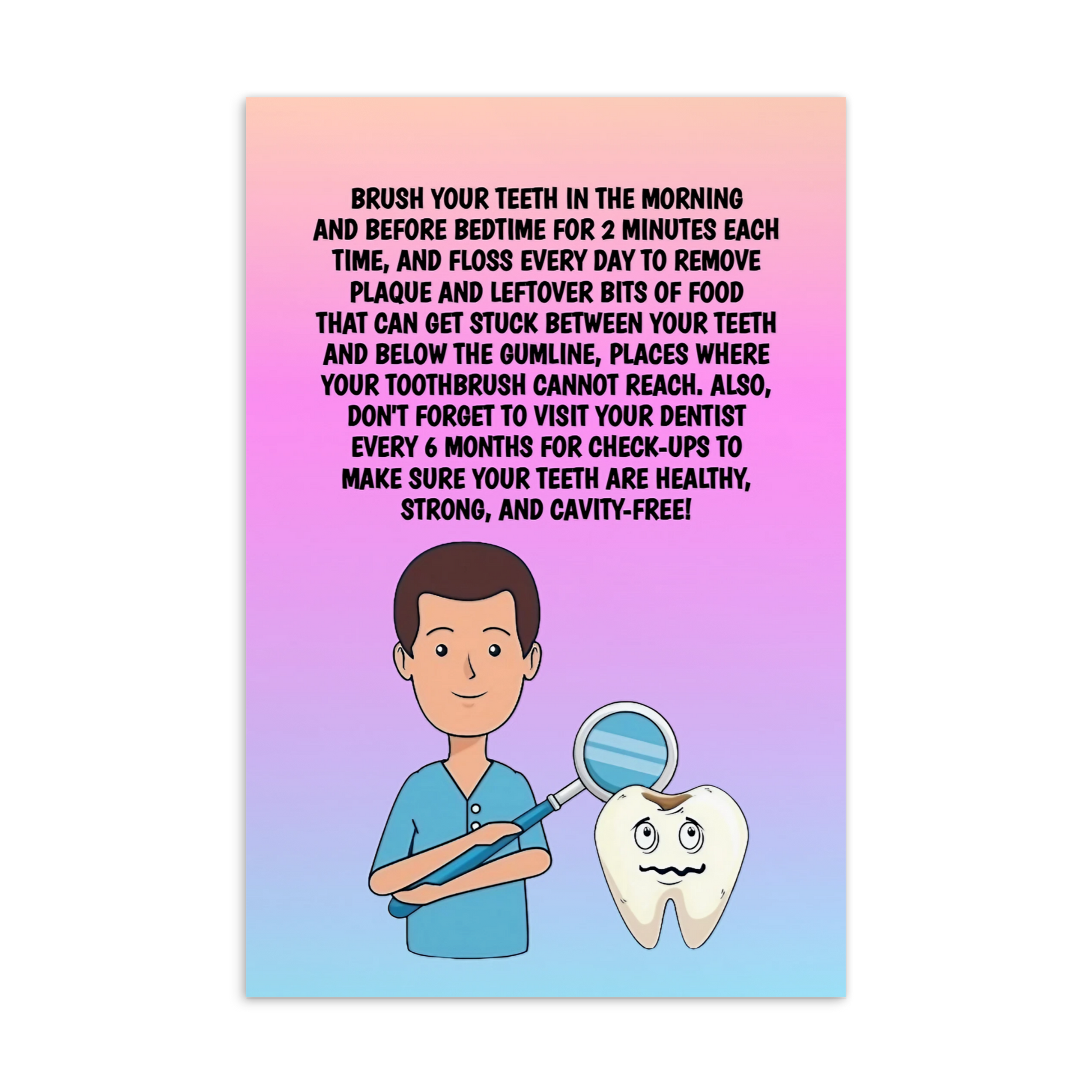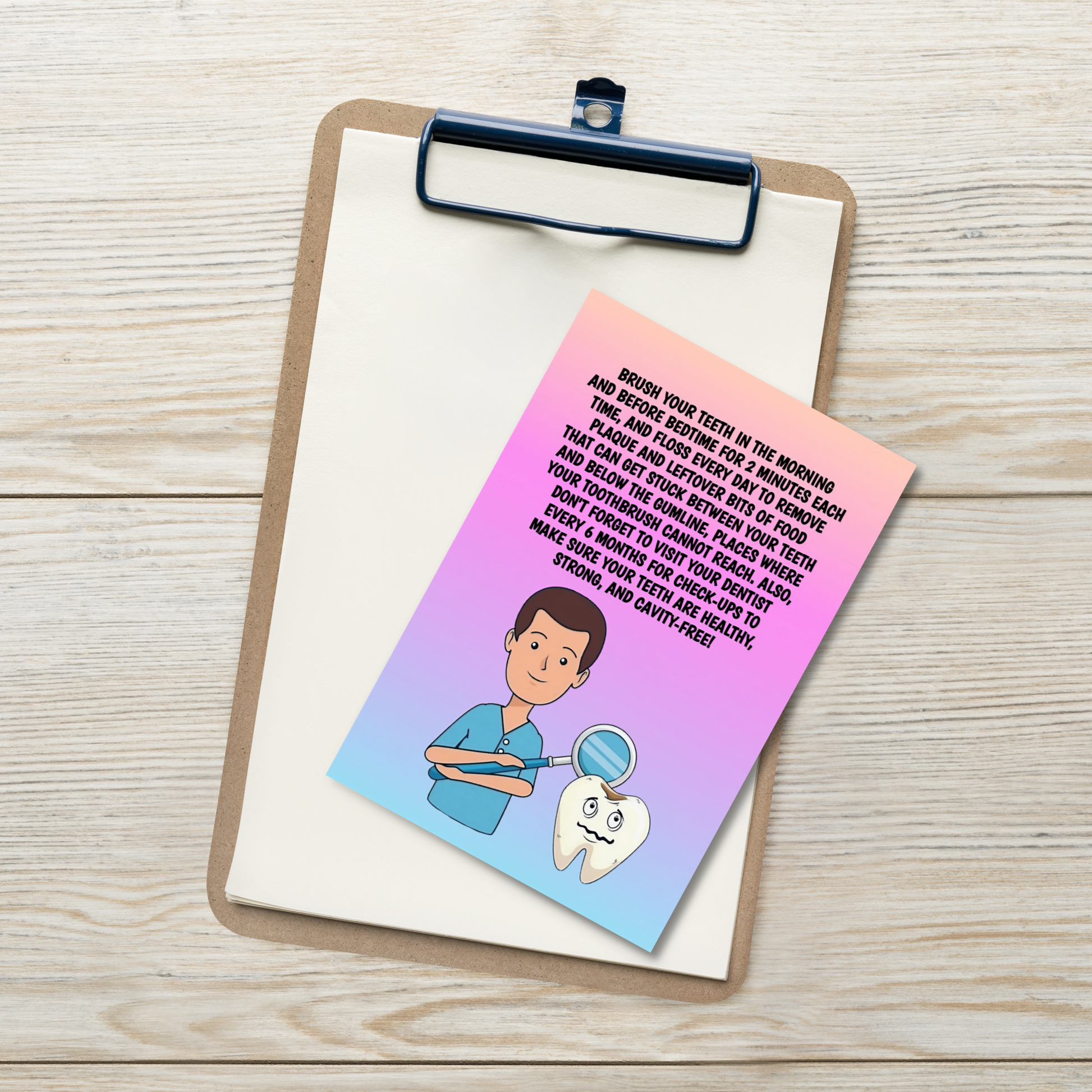 These cards are valuable tools that can be distributed to patients during dental appointments, serving as a prompt for discussing the significance of maintaining proper oral hygiene habits. Dental professionals can easily distribute these cards to reinforce the importance of oral health education with their patients.