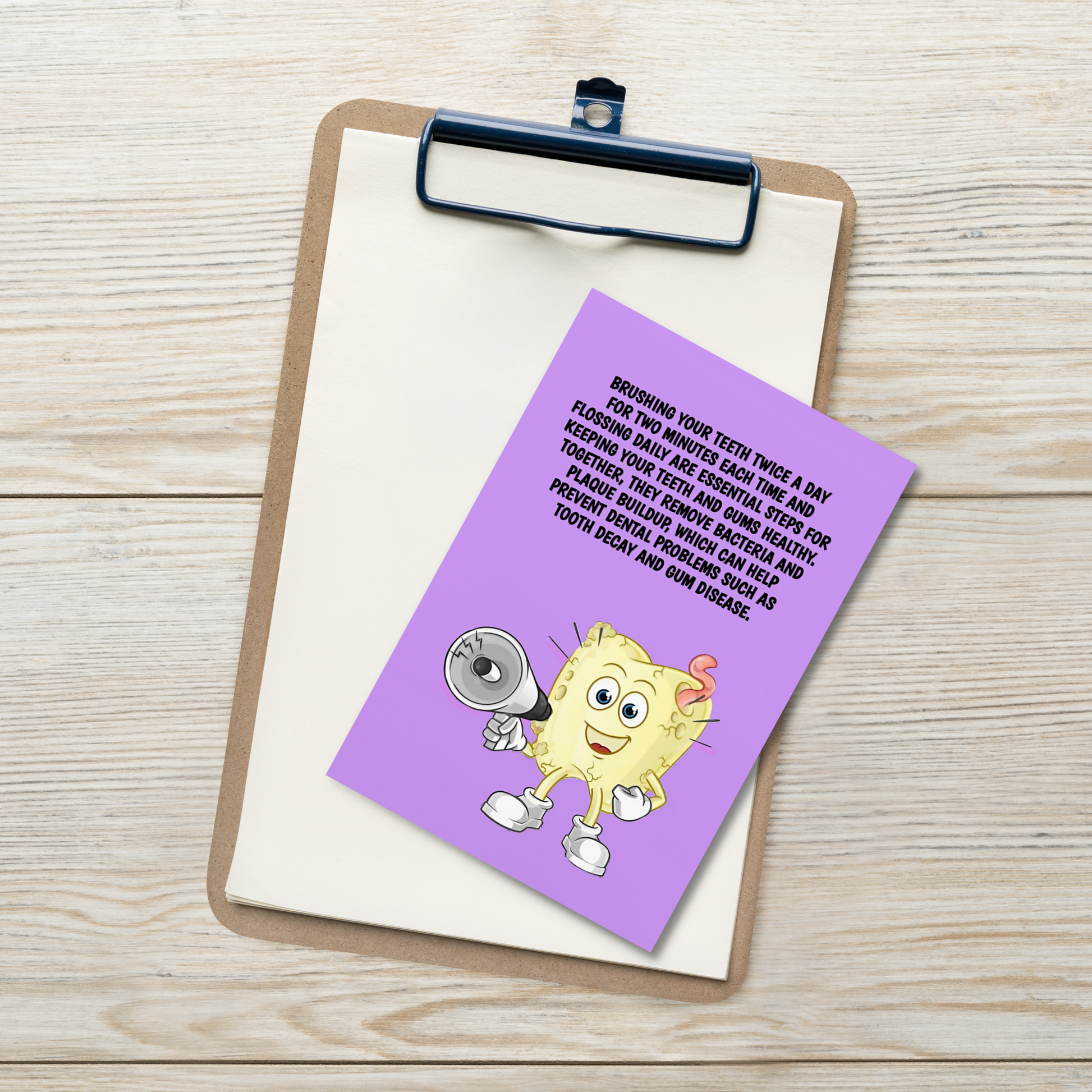 These cards are valuable tools that can be distributed to patients during dental appointments, serving as a prompt for discussing the significance of maintaining proper oral hygiene habits. Dental professionals can easily distribute these cards to reinforce the importance of oral health education with their patients.