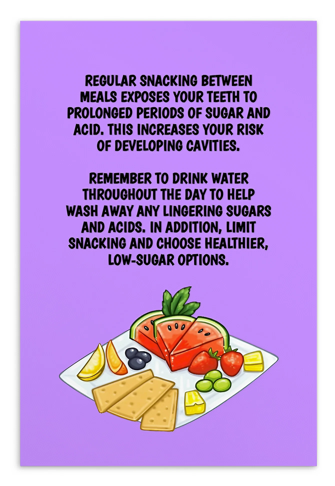 Oral Hygiene Cards- Regular Snacking Between Meals Exposes Your Teeth To Prolonged Periods Of Sugar And Acid