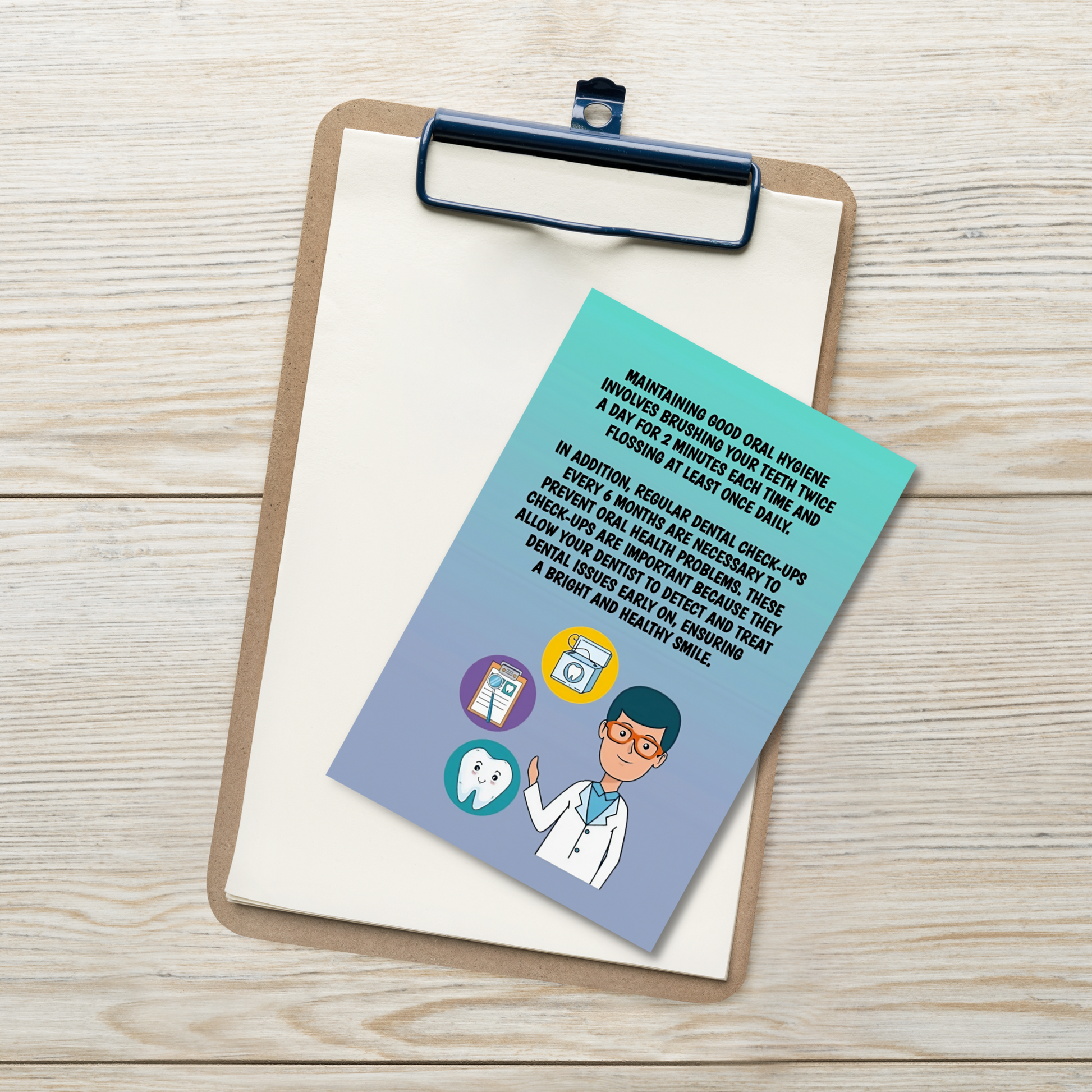 These cards are valuable tools that can be distributed to patients during dental appointments, serving as a prompt for discussing the significance of maintaining proper oral hygiene habits. Dental professionals can easily distribute these cards to reinforce the importance of oral health education with their patients.