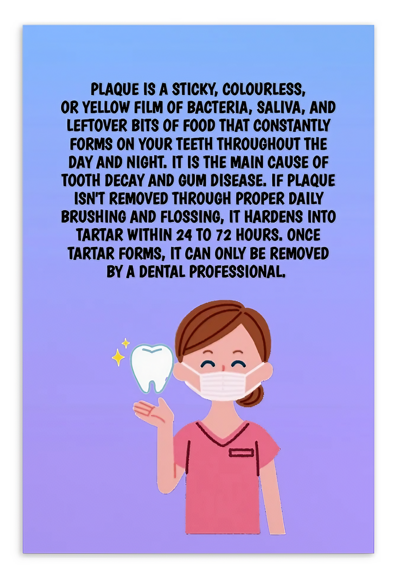 Oral Hygiene Cards- Plaque Is A Sticky, Colourless Or Yellow Film Of Bacteria, Saliva, And Leftover Bits Of Food That Constantly Forms On Your Teeth