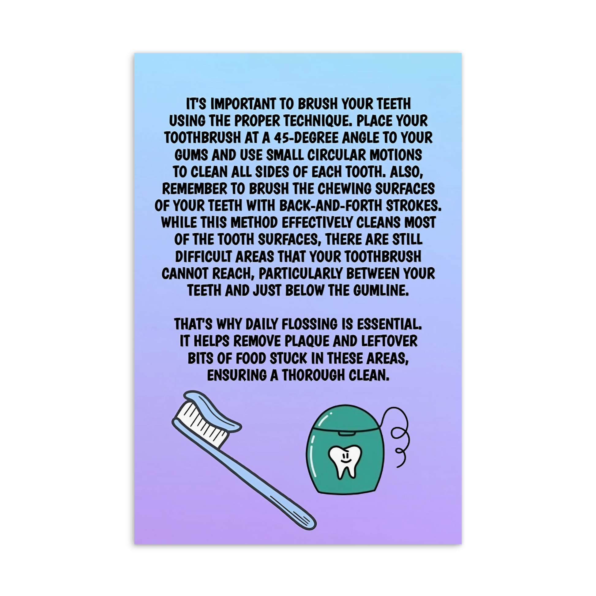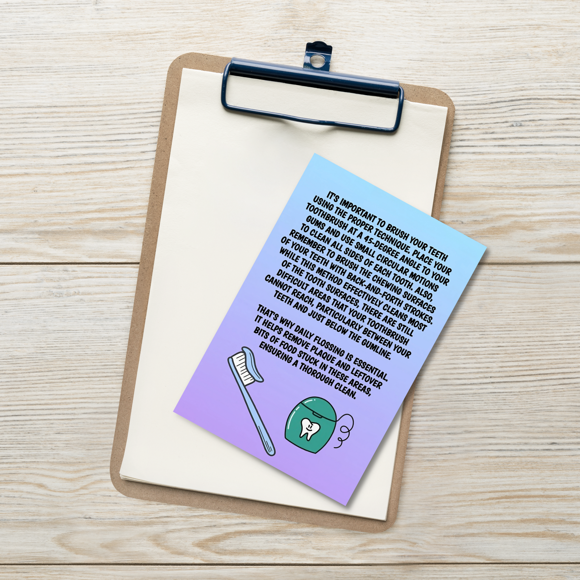 These cards are valuable tools that can be distributed to patients during dental appointments, serving as a prompt for discussing the significance of maintaining proper oral hygiene habits. Dental professionals can easily distribute these cards to reinforce the importance of oral health education with their patients.