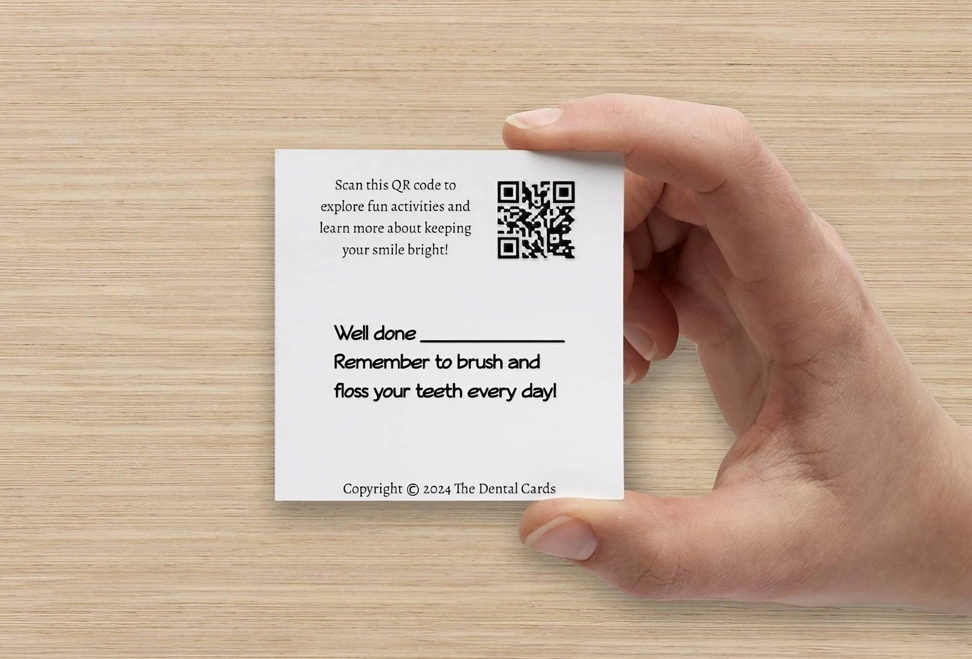 Each dental card features a QR code that directly connects to online educational content, offering an interactive and collaborative learning experience for parent and child.