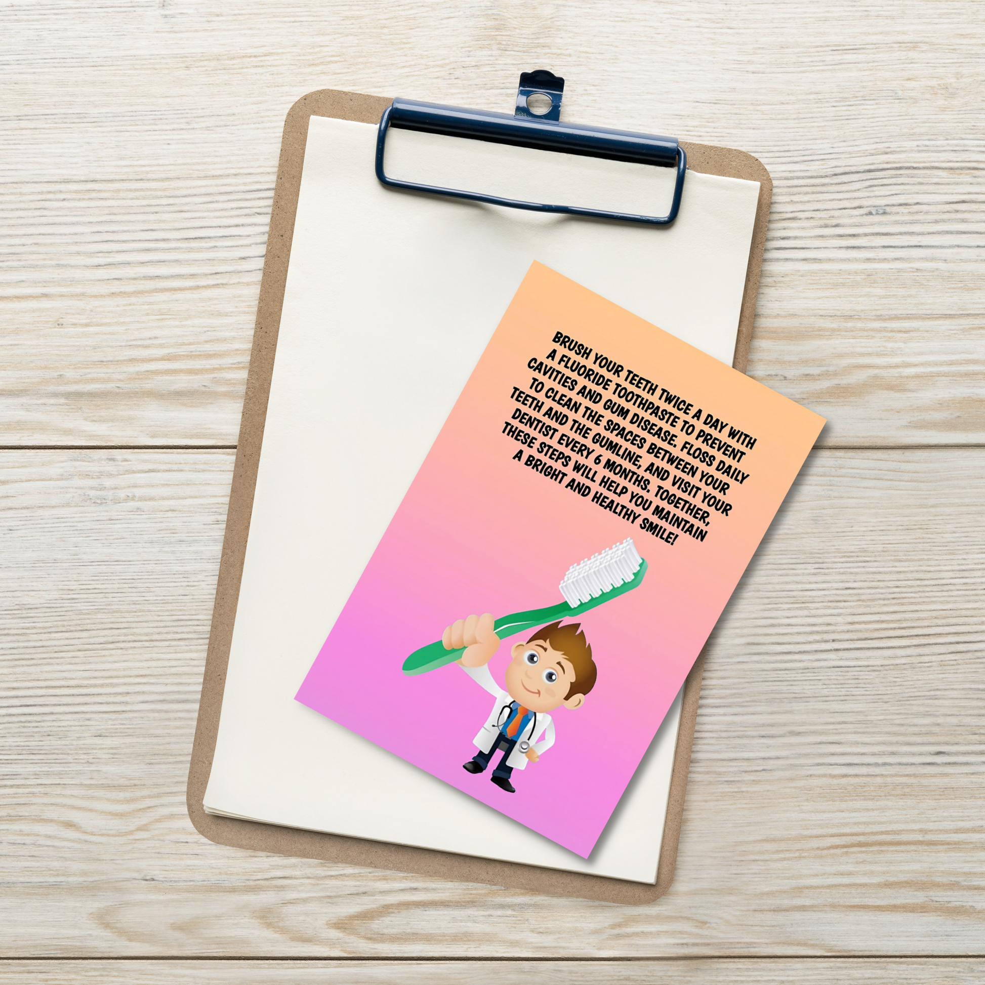 These cards are valuable tools that can be distributed to patients during dental appointments, serving as a prompt for discussing the significance of maintaining proper oral hygiene habits. Dental professionals can easily distribute these cards to reinforce the importance of oral health education with their patients.