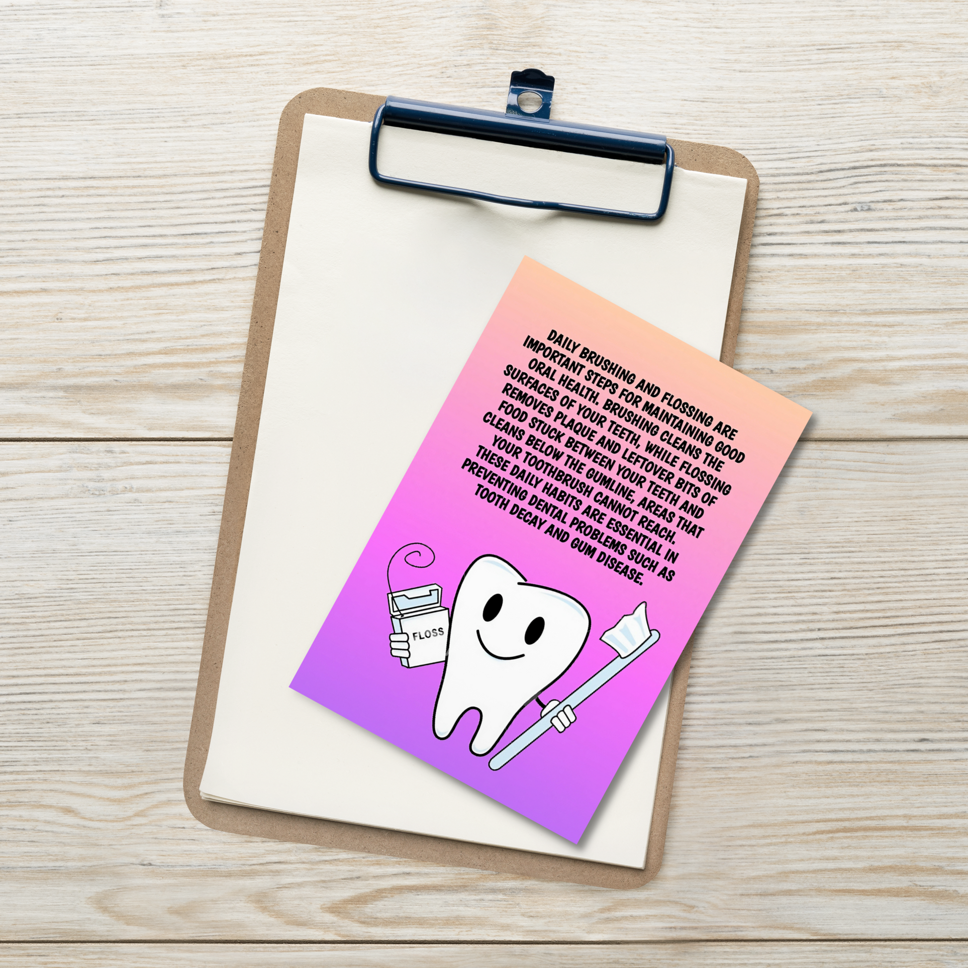These cards are valuable tools that can be distributed to patients during dental appointments, serving as a prompt for discussing the significance of maintaining proper oral hygiene habits. Dental professionals can easily distribute these cards to reinforce the importance of oral health education with their patients.