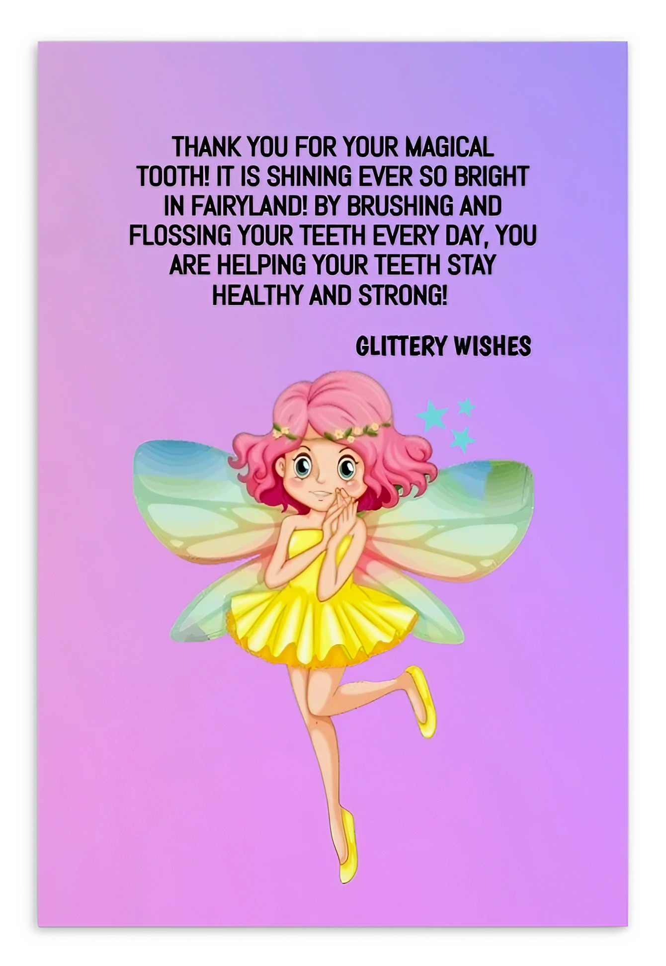 Our adorable Tooth Fairy Thank You Cards feature a special message directly from the tooth fairy herself. These whimsical cards are a thoughtful gesture for gifting children after dental extractions. Dentists can distribute these cards to their young patients not only as a reminder to maintain good dental hygiene practices but also as a token of recognition for the courage and bravery displayed during their dental visit.